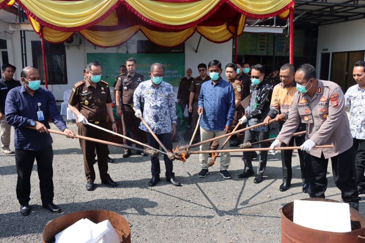 Menurut Kasi Humas Polres Pijay Ipda Mustafa, Kapolres Pijay bersama Kajari Pijay Oktaria Hartawan Achmad, S. H., M. H, bersama sejumlah pejabat lainnya di Pijay memusnahkan barang bukti narkoba jenis ganja dan sabu termasuk barang bukti pendukung lainnya di lingkungan Kantor Kejari setempat pada hari ini.