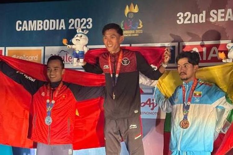 Terlihat dalam video ada 3 atlet yang tengah berdiri di podium tersebut, salah satunya atlet dari Indonesia.
