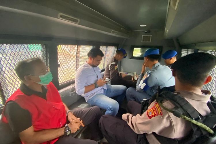 Suaidi Yahya memakai rompi merah dan tangan diborgol, dibawa langsung oleh tim penyidik dan pengamanan lainnya menggunakan mobil tahanan Kejaksaan Negeri Lhokseumawe.