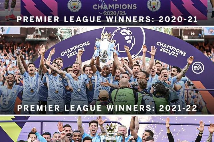 Manchester City Juara Liga Inggris Tiga kali secara beruntun. Musim ini Runner up-nya Arsenal, musim lalu Runner Up-nya Liverpool, dan musim 2020-2021 Runner Up-nya Manchester United.
