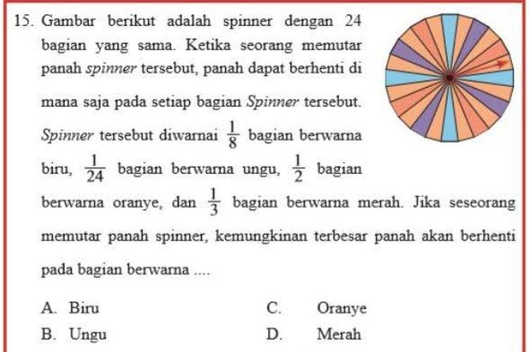 15. Gambar berikut adalah spinner dengan 24 bagian yang sama. Ketika seseorang memutar panah spinner tersebut, panah bisa berhenti di mana saja pada setiap bagian spinner tersebut.