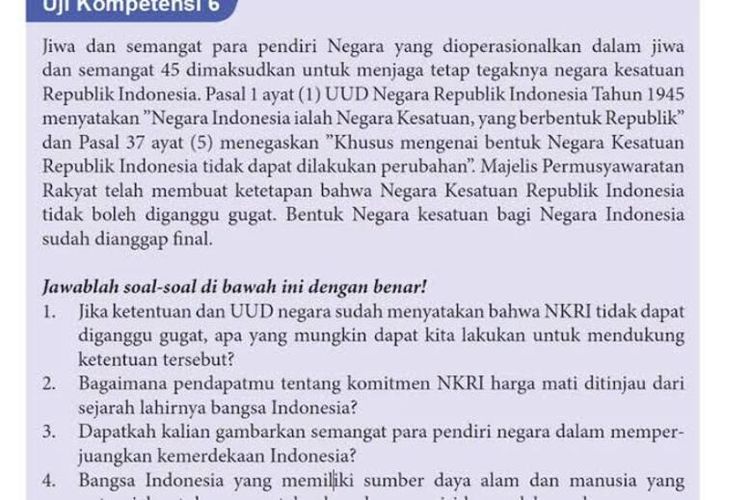 Pada soal dan kunci jawaban PKN Kelas 9 halaman 147 Uji Kompetensi 6 ini akan membahas materi kesatuan NKRI.