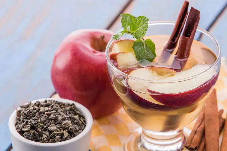 Tambahkan daun teh hitam dan potongan apel. Masak selama 5 menit.
