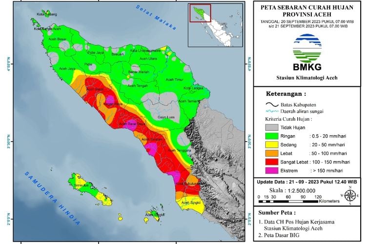 PIKIRANACEH.COM – Berdasarkan hasil pemetaan distribusi curah hujan dari 168 titik pengamatan di Provinsi Aceh, terdeteksi hujan dengan kategori “Sangat Lebat” hingga “Ekstrem” terjadi di wilayah pesisir Barat – Selatan Aceh.