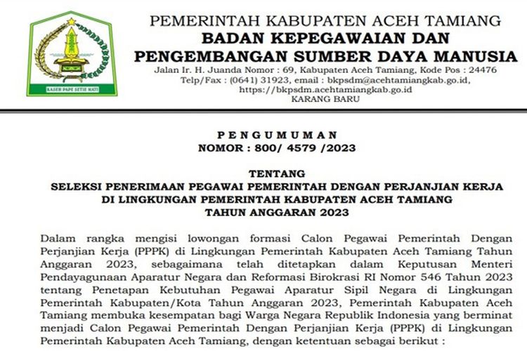 Perekutan pegawai PPPK ini berdasarkan pengumuman Dinas BKSDM Aceh Tamiang nomor 800/ 4579 /2023 tentang Seleksi Penerimaan Pegawai Pemerintah Dengan Perjanjian Kerja Di lingkungan Pemkab Aceh Tamiang tahun 2023 tanggal 20 September 2023 yang ditandatangani Kadis BKSDM Aceh Tamiang, Muhammad Mahyaruddin.