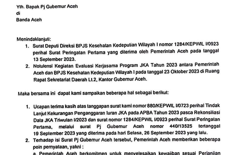 Dalam surat itu Mariamah menjelaskan, SP2 itu dilayangkan untuk menindaklanjuti Surat Deputi Direksi BPJS Kesehatan Kedeputian Wilayah Nomor 1284/KEPWIL 1/0923, perihal Surat Peringatan Pertama (SP1) yang diterima oleh Pemerintah Aceh pada tanggal 13 September 2023.